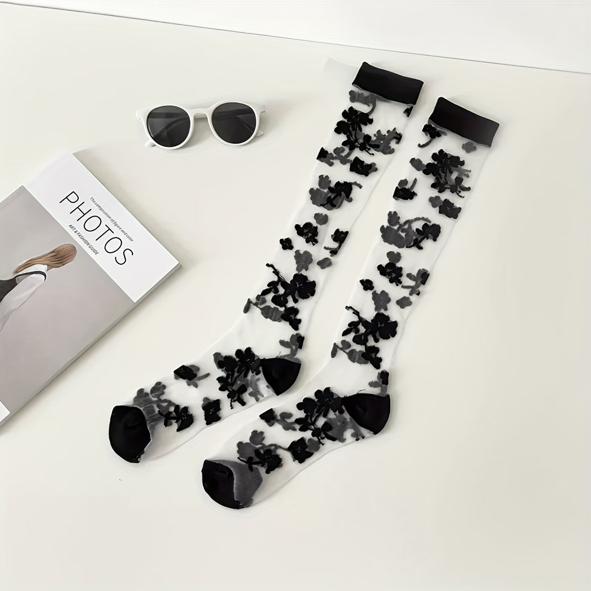 3 Pairs Flower Pattern Semi-sheer Calf Socks