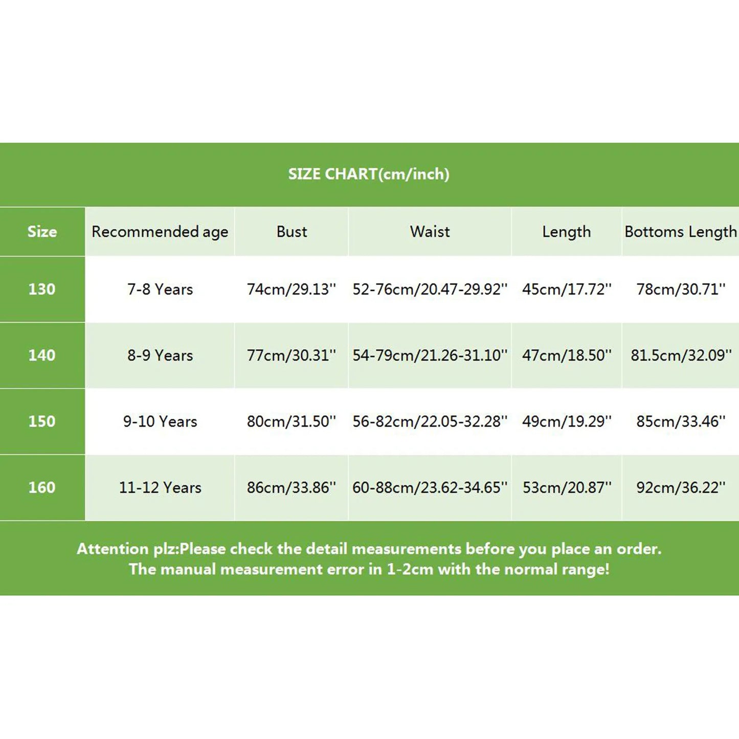 Size:160 | Recommended age:11-12 Years | Bust:86cm/33.86'' | Waist:60-88cm/23.62-34.65'' | Length:53cm/20.87'' | Bottoms Length:92cm/36.22'' |
