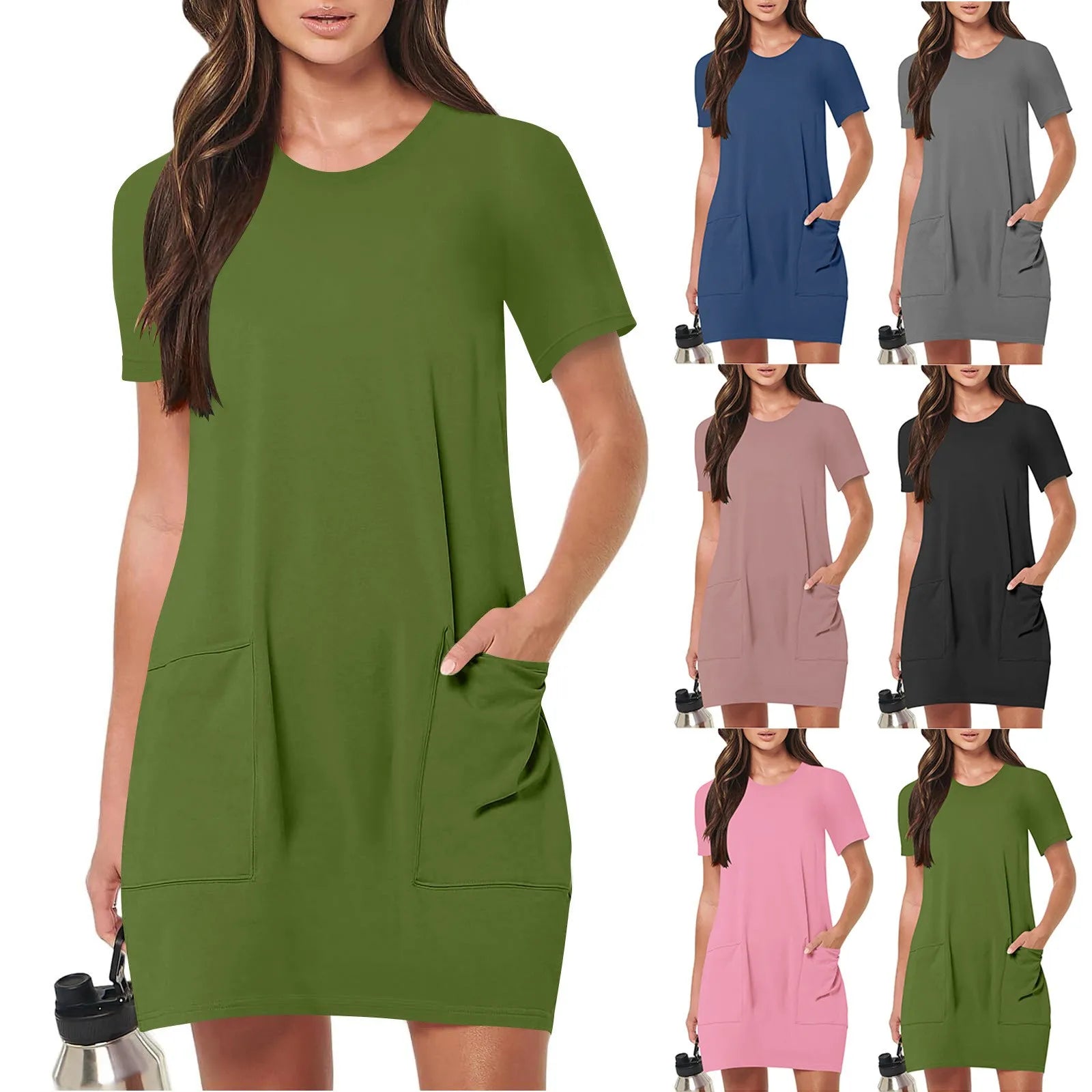 Women's Fashionable Solid Color Short Sleeved Round Neck Casual Sports Short Dress With Pockets